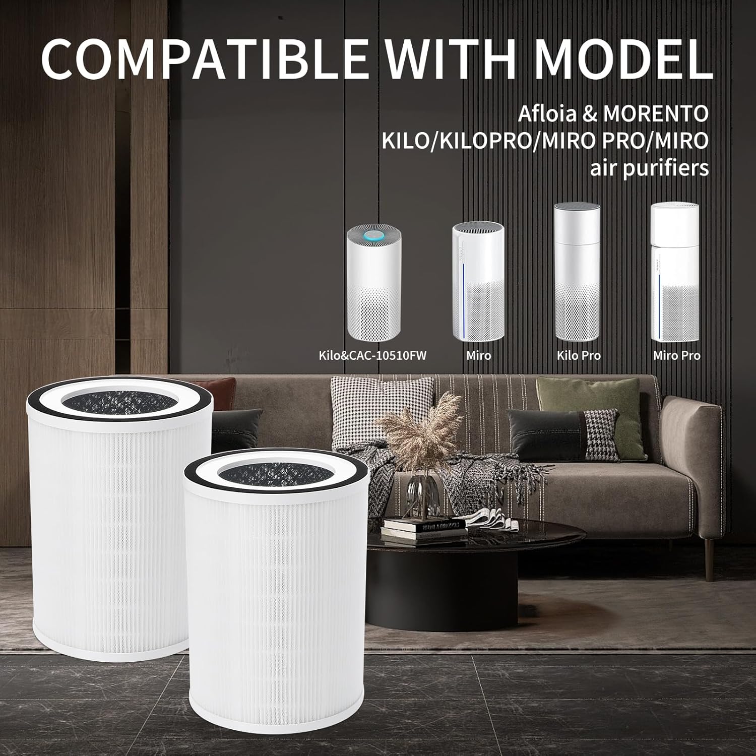 Ensure your air purifier continues to deliver clean, fresh air with this premium replacement filter. Compatible with Afloia KILO, KILO PRO, MIRO, MIRO PRO, and MORENTO KILO models, this filter features a 360° 3-stage filtration system, combining a fine preliminary filter, H13 true HEPA filter, and activated carbon filter to efficiently capture airborne particles as small as 0.3 microns. Installation is a breeze with the tool-free snap-in design, and the filter’s service life lasts up to 2200 hours, with a recommended replacement every 3-6 months depending on your environment. This package includes 2 KILO filters, making it a cost-effective solution for maintaining your air purifier and ensuring your home remains a healthy and breathable environment.