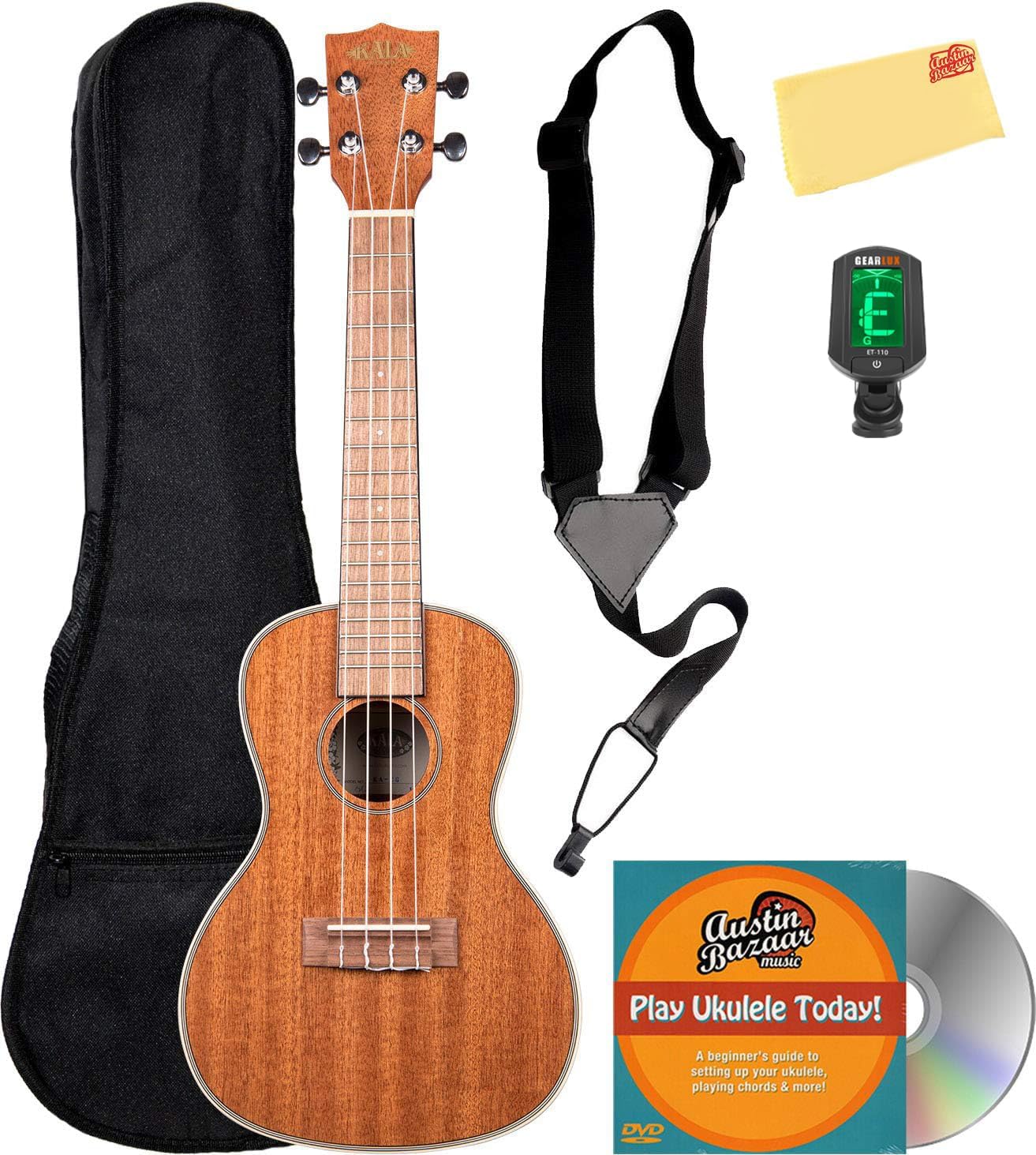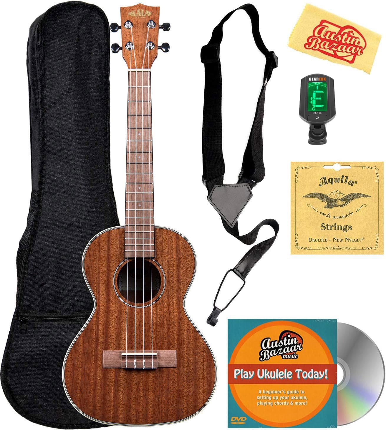 Adding value to your purchase, Austin Bazaar bundles your instrument with necessary accessories. Everything you need to start playing immediately comes in one box. Save yourself the hassle and save some money while you're at it. A gig bag is included so you can keep your instrument safely packed away when you're on the go. An easy-to-use clip-on tuner is included so you can keep your instrument in tune. A strap is included so you can practice or better yet perform while standing up. Strings are included so you have extra for later. An Austin Bazaar instructional DVD is included so you can pick up some tips while learning your new instrument. An Austin Bazaar polishing cloth is included so you can keep your new instrument in mint condition. The Gloss Mahogany line features a high-gloss finish to enhance the simple elegance of the Mahogany woodgrain. The gloss adds a smoothness and sturdiness to the uke and a Cream binding ties it all together.Size: TenorTop: MahoganyBack & Sides: MahoganyBinding: CreamFinish: GlossNeck: MahoganyFingerboard: WalnutNut & Saddle: GraphTech NuBoneHeadstock: StandardStrings: Aquila Super NylgutElectronics: NAMeasurementsScale Length: 17 inches, Overall Instrument Length: 26.125 inches, Body Length: 11.75 inches, Number of Frets: 18, Width at Upper Bout: 7 inches, Width at Lower Bout: 9.125 inches, Width at Waist: 5.5 inches, Body Depth: 3.12 inches, Fingerboard Width at Nut: 1.39 inches, Fingerboard Width at Neck/Body Joint: 1.81 inches