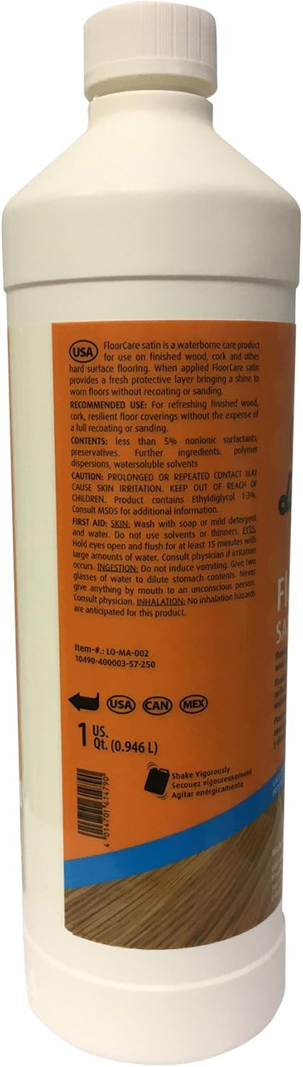FloorCare Satin is a waterborne care product for use on finished wood, cork and other hard surface flooring. When applied FloorCare Satin provides a fresh protective layer to refresh worn floors without recoating or sanding. One Quart will cover approximately 250 square feet.