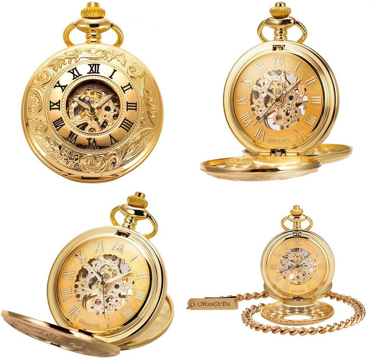 ManChDa Mechanical Roman Numerals Dial Skeleton Pocket Watches with Box and Chains for Mens Women