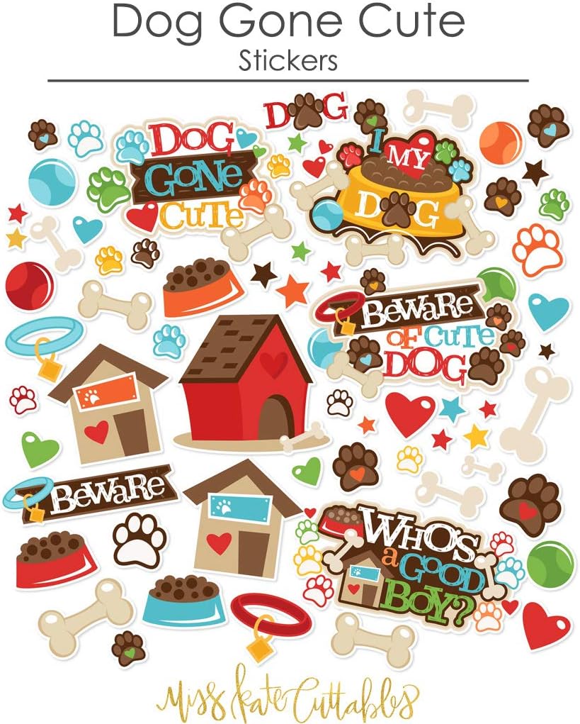 Miss Kate's Paper & Sticker Kit For Scrapbookers, Card Makers, & CraftersAre you always on the lookout for new supplies with cute designs?Then look no further because we’ve got you covered!The Miss Kate Cuttables Paper & Sticker Kit is exactly what you need!About Out PaperWe get lots of questions and comments about the type of paper Kate chooses to print Miss Kate's paper on.Our Bristol sheets provide a stiff, strong surface to work on that is silky smooth to the touch. It is not cardstock and it is not thin paper. The printing has a slight gloss to give it some dimension. We love our paper and think you will too!Paper & Sticker Kit DescriptionThe Dog Gone Cute Paper has a wide variety of Patterns including Polka Dots, Stripes, Stars, Chevron, Ric Racs, Zig Zags, Paw Prints, Hearts, Dog Bones, Dog House, Bouncing Balls, Dog Collars, Dog Tags, and Dog Food.The Dog Gone Cute Sticker Sheet has a wide variety of designs, including "Dog Gone Cute" "I Heart My Dog" "Beware of Cute Dog" "Beware" "Who's a Good Boy?" "Dog" Titles, Paw Prints, Hearts, Stars, Bones, Dog House, Bouncing Balls, Collars, Tags, Food.THEME: Works with New Puppies Puppy Pets Goldendoodle Cavapoo Golden Retreiver Labrador Retriever German Shepherd Poodle and any other Breed A Dogs Life!✔ 80lb Premium Specialty Paper✔ 17 - 12"x12" sheets of DOUBLE-SIDED paper✔ 33 Designs✔ 1 - 8"x12" Sticker Sheet✔ Acid and Lignin Free (our paper will NOT damage other things)✔ Archival Quality (beautiful colorful prints that will never fade)
