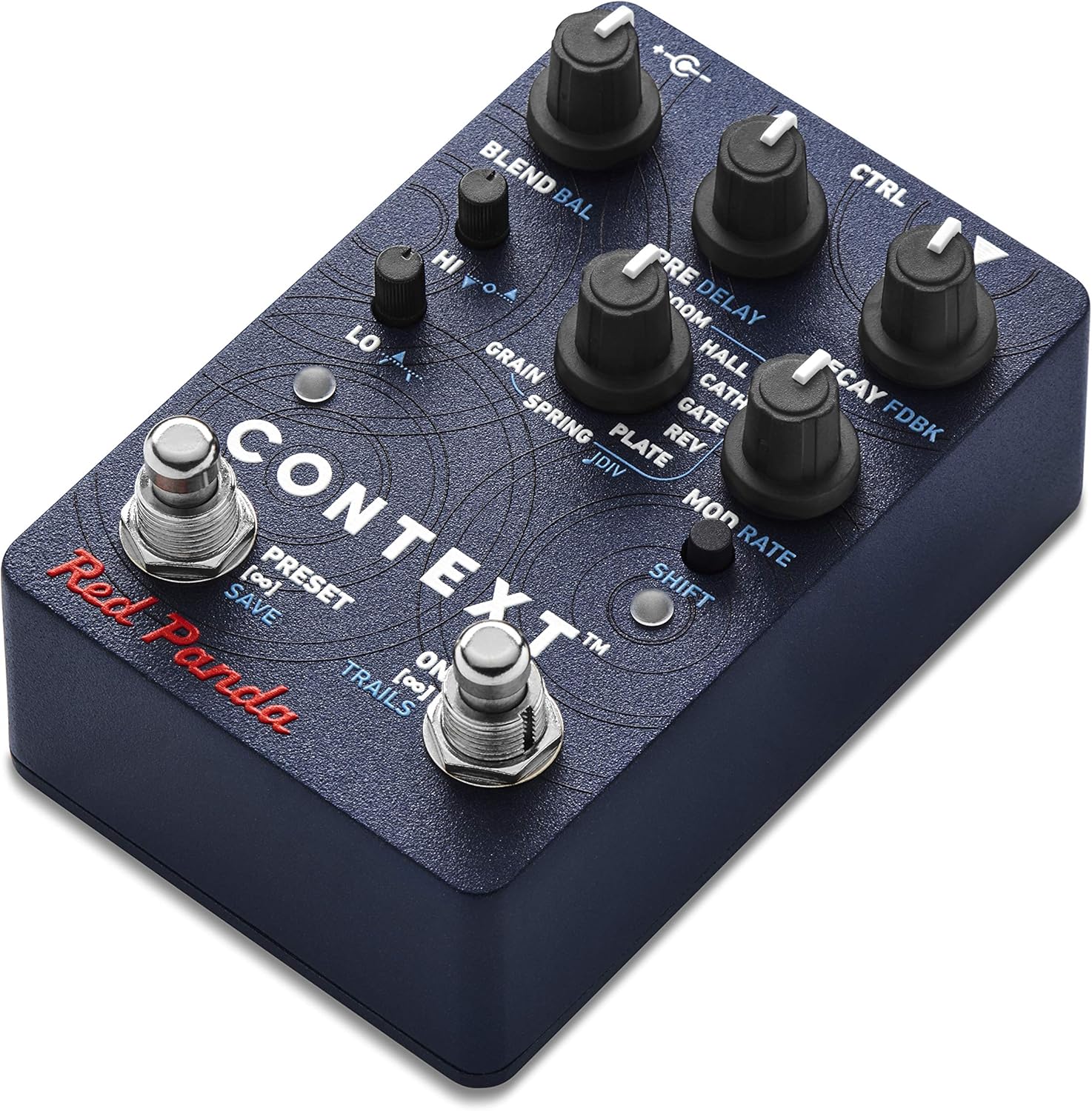 The Context is a reverb pedal inspired by 1980’s rack mount reverbs. It has 8 algorithms, including room, hall, cathedral, gated reverb, reverse reverb, plate, spring, and a granular reverb. Each algorithm features separate high and low frequency damping controls, pre-delay, modulation, dynamics (duck/expand), and infinite hold. In addition, delay is always available, along with tremolo in spring mode. The modulation knob changes the amount and character of the internal reverb modulation, specific to each algorithm. It gives you a mix of different modulation types from 1980’s and early 90’s reverbs, including chorus modulation, random modulation that keeps the pitch stable, and deep modulated reverbs. Holding down the shift button adjusts the modulation rate. Reverse reverb fades in louder and brighter over time, giving the impression of playing backwards. Modulation adds a wash of normal reverb. The spring reverb was designed using the techniques and algorithms that were used in 1980’s reverbs, but with enough DSP power to drip and feel like a spring tank. You can adjust the length of the decay, high and low frequency damping. The modulation is tremolo with adjustable intensity and speed. Grain mode is a granular reverb inspired by the Ursa Major SST-282 Space Station. The SST-282 was released in 1978 and used multiple delay taps with modulation to create reverb effects. The Context can create ghostly reverb effects, slowly sweeping resonances, and at higher modulation settings is a multi-voice granular processor that creates clouds of detuned sound fragments for entirely new reverb sounds. When the shift button is held down, the top row of knobs adjust delay parameters. The low and high damping knobs adjust dynamics for ducking reverb or an expander for more reverb on louder notes, with adjustable threshold and recovery time. Holding down the foot switches gives you two different types of infinite sustain. One preset available on the left footswitch, 4 using a remote footswitch, and 127 via MIDI. The expression pedal can be assigned to any combination of parameters. We also have a web-based editor for tweaking and managing your presets. Algorithms ROOM - fast buildup, good for thickening sounds HALL - slower buildup with longer initial delay CATH(edral) - emulates a large, reflective space GATE(d) - gated reverb with non-linear decay REV(erse) - reverse reverb PLATE - bright, dense studio plate reverb SPRING - spring reverb GRAIN - granular reverb Controls BLEND - wet/dry blend (to 100% wet) PRE - predelay DECAY - reverb decay HI - high-frequency damping LO - low-frequency damping MOD - modulation amount and character Controls (shift) BAL - reverb/delay balance DELAY - delay time FDBK - delay feedback v-o-^ - dynamics ducking/off/expander and recovery time /\-_-_ - dynamics threshold RATE - modulation rate Designed and assembled in USA. The Context 2 requires a 9 V 250 mA center negative power supply (not included). New in version 2 The Room, Hall, Cathedral, Gated, and Plate reverb algorithms are updated versions of the Context version 1 reverbs, but now delay is available in all modes. They also have separate low and high damping controls with more range, modulation, dynamics, and infinite hold. The update also adds stereo input/output, TRS and USB MIDI, fully assignable expression pedal._Current Stock: SKU: RPL-102V2 Shipping: Calculated at Checkout Size: 3.05" x 4.75" x 2.5" Input impedance: 1 MΩ Output impedance: <1 kΩ Bypass: Analog buffered Power: 9 VDC, center negative Current: 250 mA