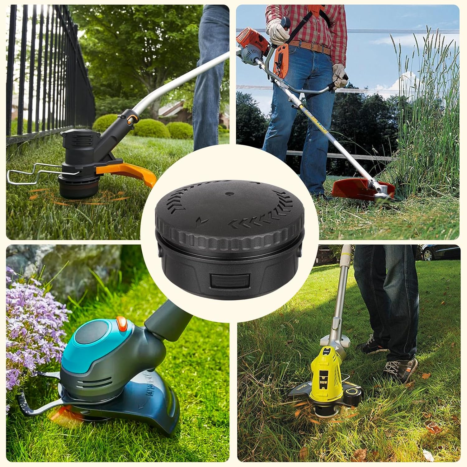 💐Make sure your trimmer turn counter clockwise!💐Compare the existing mounting bolt or nut on your shaft of trimmer to determine the new bolt or nut you required! Identify which nut or bolt from the package threads easily counter clockwise onto the trimmer shaft(Must be rotated counter clockwise!)💐The trimmer shaft compatible with one of following bolt or nut fit for our TOUSSAINT grass trimmer head .Bolt A:M8x1.25-6G-LH ; Bolt B:M10x1.25-6G-LH ; Bolt C:M7x1.0-6G-LH; Nut A:M8x1.25-6H-LH ; Nut B:M10x1.25-6H-LH ; Nut C:M10x1.0-6H-LH. 💐If your shaft doesn't fit above-mentioned bolt and nut,please don't buy the bump feed trimmer head.💐Only for left hand thread on the shaft ! Not for right hand thread on the shaft !💐Please read the description,pictures and viedos carefully before purchasing!💐Please contact us if you have any questions! 🍁How to use a TOUSSAINT bump feed trimmer head? 1.Insert into the aligned holes with a tool.Turn clockwise to remove the old bump head 2.Identify which nut or bolt from the package threads easily counter clockwise onto the trimmer shaft 3.Use a screwdriver to open the button of bump head 4.Place the identified nut or bolt into the recessed hex cavity of the trimmer head 5.Hold the nut or bolt in the recessed hex cavity with one finger 6.Attach the grass trimmer head to the string trimmer shaft 7.Fix the string trimmer shaft with a wrench 8.Turn the trimmer head counter clockwise to thread the nut or bolt onto the trimmer shaft with the shaft rotation locked 9.WARNING! After tightening, if the trimmer head can move up and down the shaft (if there is a GAP), a spacer is needed. Conversely, it is not needed 10.Identify grooves and convex grooves of the trimmer head 11.Put the other half of the trimmer head in 12.Press and turn the knob in the direction of arrows so that its arrow is aligned with the metal hole 13.The small hole in the trimmer head must be aligned with the hole on the outside of the trimmer head 14.String the trimmer line through the metal hole 15.Make the orange parts on either side of grass trimmer head symmetric 16.Press and turn the knob in the direction of arrowsto make the trimmer line the length you want Please see the installation video on the product details page! 🌸TOUSSAINT bump feed trimmer head is widely compatible with following trimmer head that fit one of following bolt or nut :Bolt A:M8x1.25-6G-LH ; Bolt B:M10x1.25-6G-LH ; Bolt C:M7x1.0-6G-LH; Nut A:M8x1.25-6H-LH ; Nut B:M10x1.25-6H-LH ; Nut C:M10x1.0-6H-LH : Compatible with Echo Speed Feed 400 trimmer head Compatible with Ryobi trimmer head Compatible with Ego power string trimmer head Compatible with Echo weed whacker head replacement Compatible with Dewalt weed wacker head Compatible with Husqvarna weed eater head Compatible with Craftsman trimmer head Compatible with Shindaiwa trimmer head Compatible with Honda trimmer head Compatible with Kobalt trimmer replacement head Compatible with Redmax weed eater head Compatible with Troy Bilt trimmer head Compatible with Milwaukee weed eater head Compatible with Oregon weed eater head Compatible with MTD string trimmer head Compatible with Homelite weed eater trimmer head Compatible with Hyper tough trimmer head Compatible with Weed Warrior string trimmer replacement bump head